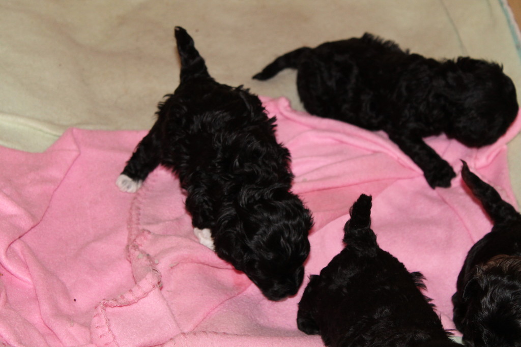 Die Vier sind leider noch sehr schwer auseinander zu halten, weil sie alle fast schwarz sind. Nur an weißen Pfötchen, weiße Krallen oder weiße Brustlätzchen sind sie zu unterscheiden. Das tägliche Wiegen wird uns sicher helfen, mehr Unterschiede zu finden.